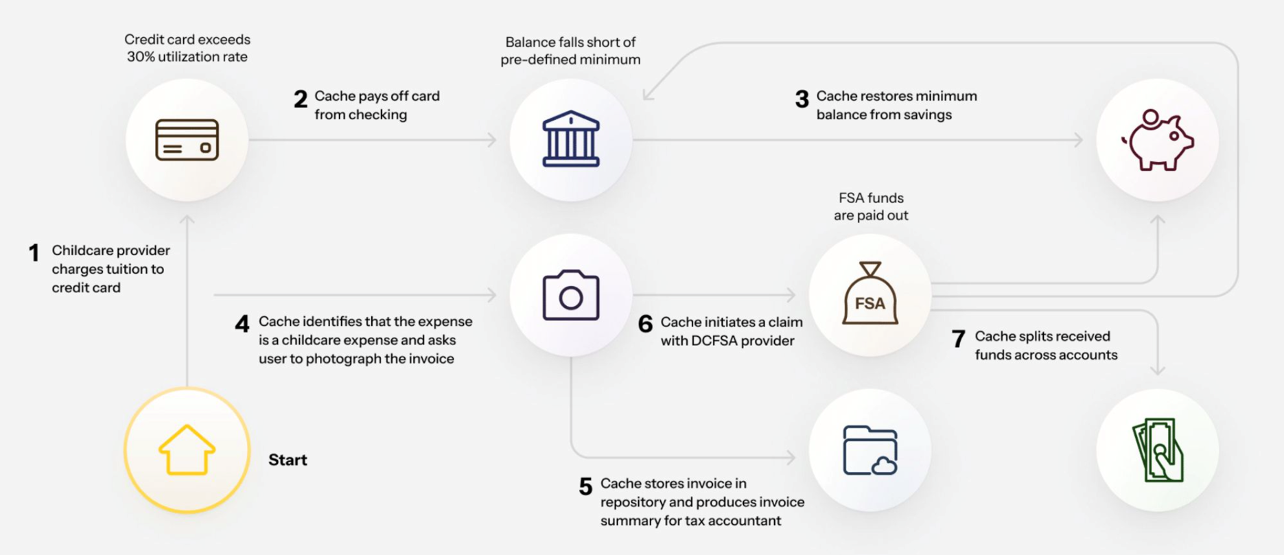 Cache wants to enable banks to transform from 'money holders' to 'money managers'. Instead of trying to change consumer behavior, which Cache's predecessors have tried to do unsuccessfully, Cache is aiming to embrace consumer behavior by injecting automation into the 1-2 minutes a day each person spends on their personal finances. In a bank sponsored 'Cache ecosystem' money deposted into accounts would be automatically routed to service debt, accrue interest, and add to savings in the most efficient and cost effective way. For the average retail banking customer (those without assets actively managed by a wealth advisor) the following workflow is an example of Cache's system at work (click to enlarge):